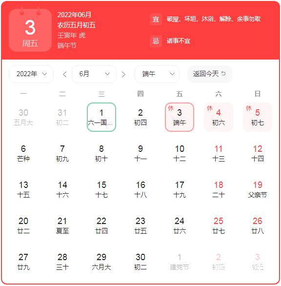 6月3日至5日放假,共3天。6月6日(星期一)正常上班。